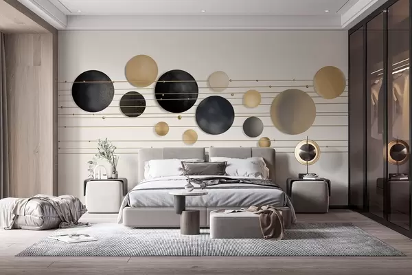 Fototapet Design abstract modern cu cercuri texturate în tonuri de alb, galben și gri, conectate prin linii subțiri, artă minimalistă Nr. w09060