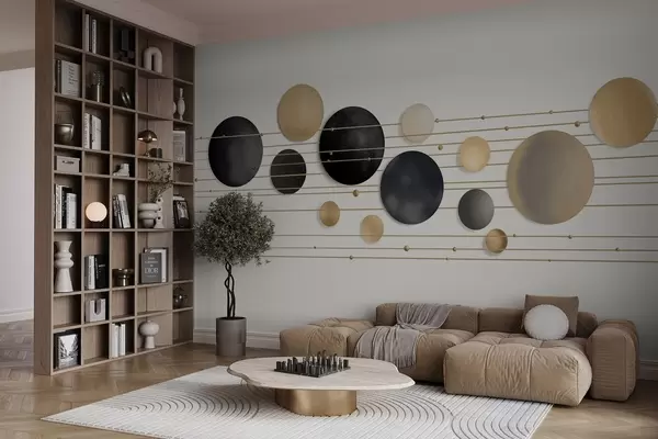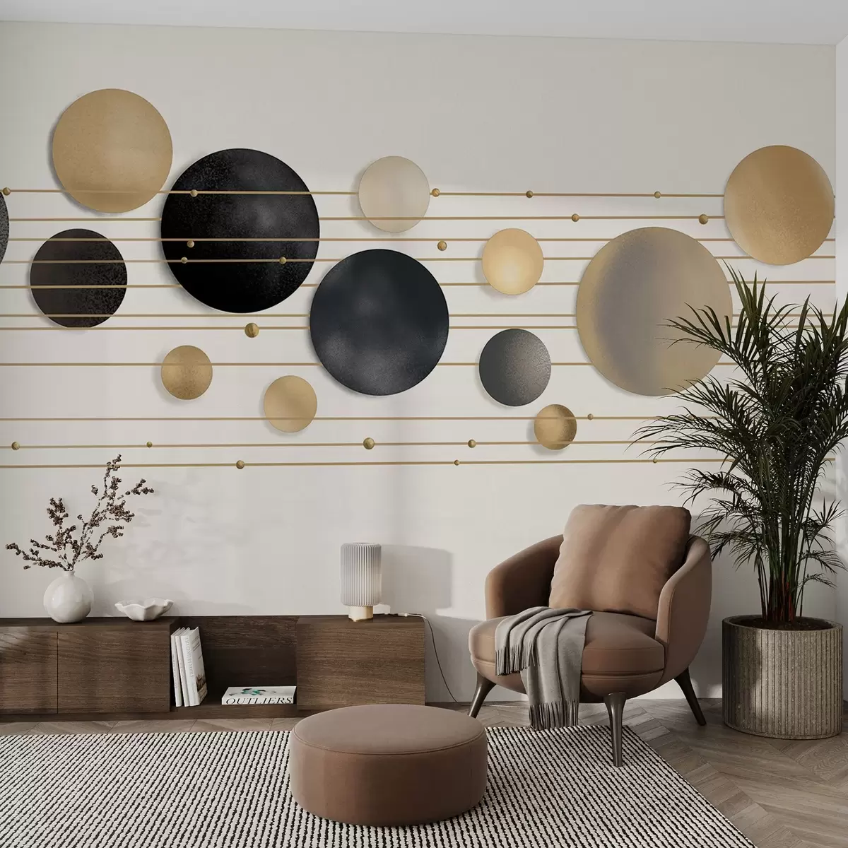 Fototapet Design abstract modern cu cercuri texturate în tonuri de alb, galben și gri, conectate prin linii subțiri, artă minimalistă Nr. w09060