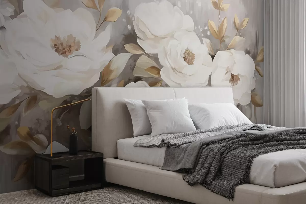 fototapet Flori albe cu frunze galbene, petale moi, aranjament floral delicat, paletă de culori neutre, tușe texturate w09062