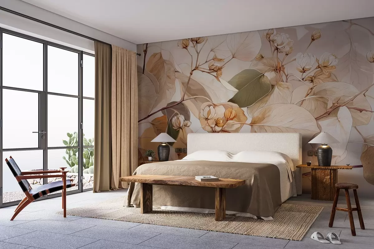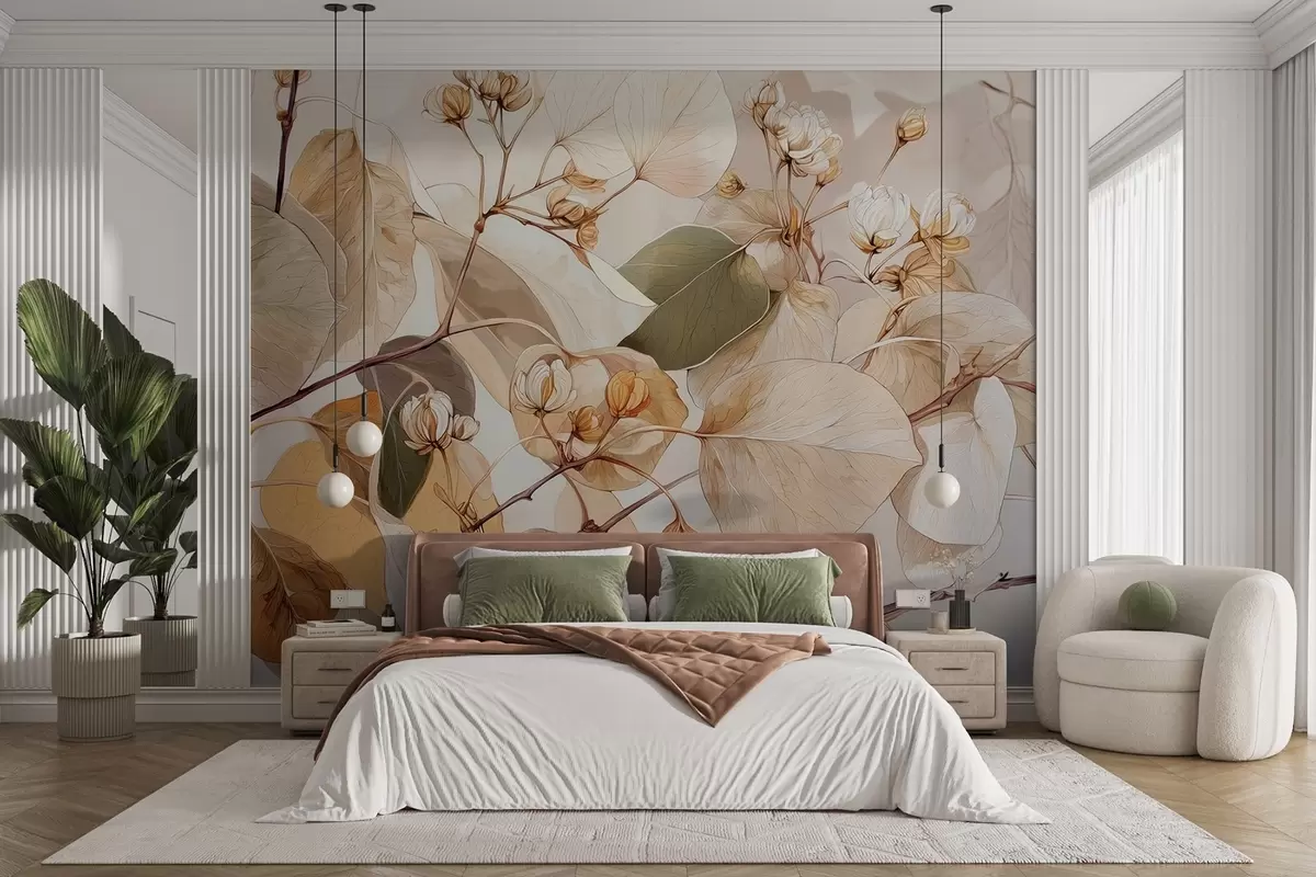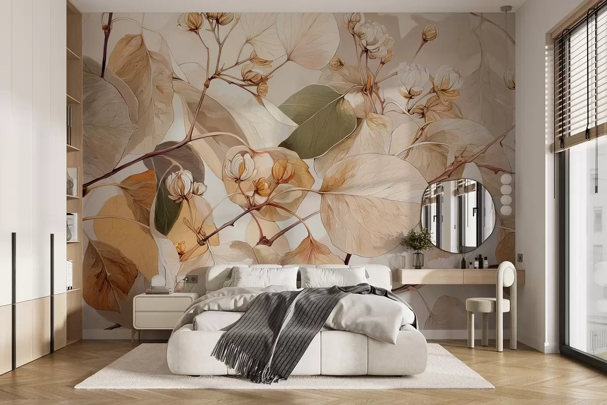 Fototapet Ramuri de frunze de plop și flori în stilul picturii în ulei în tonuri de bej Nr. w09082