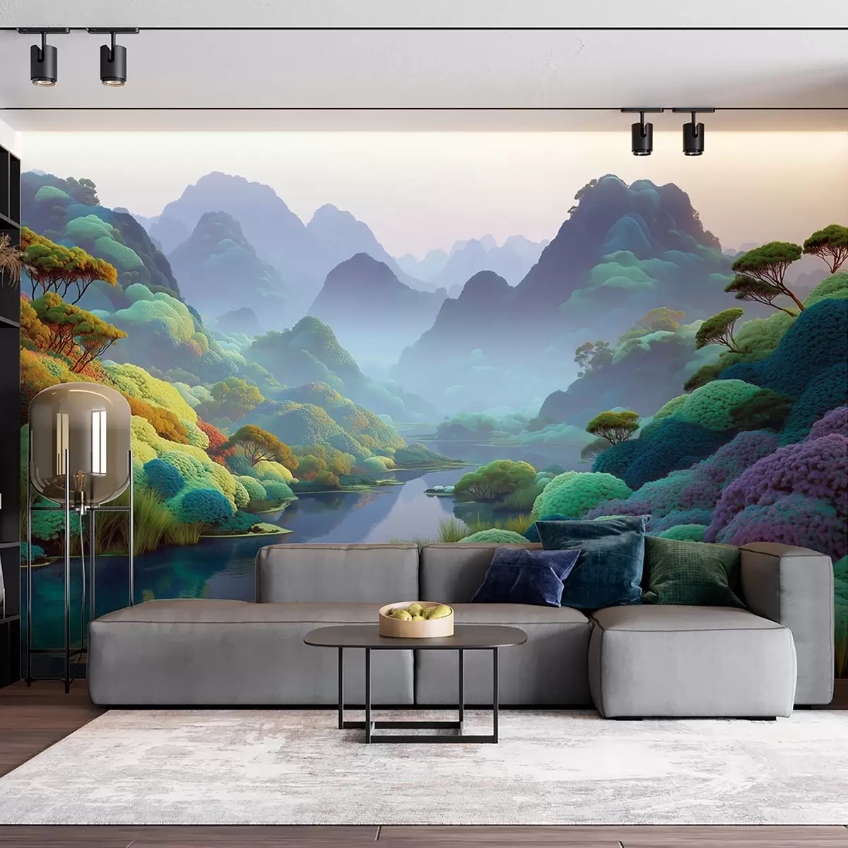Fototapet Peisaj montan cu un râu în tonuri albastre cu copaci și tufișuri Nr. w09088
