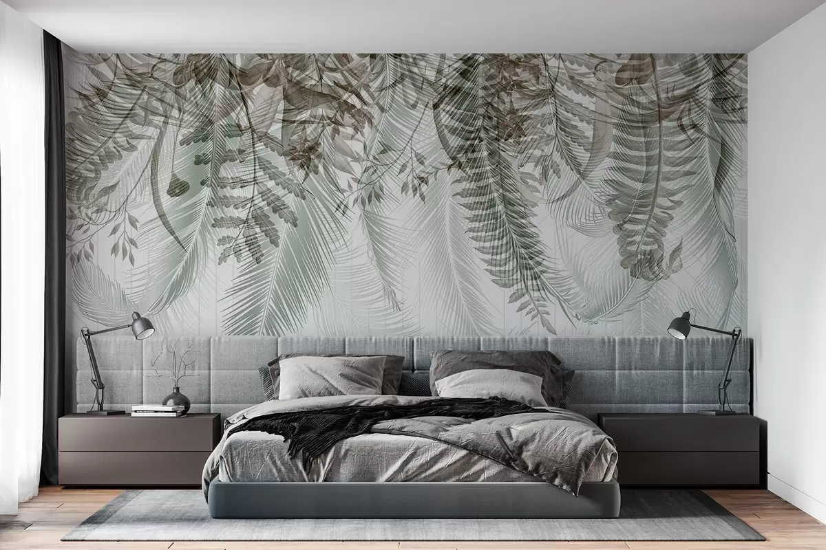 Fototapet Delicate care se încadrează ferigă tropicală și frunze de palmier, fundal geometric, lumină moale, culori mute, elegant Nr. w09106v1