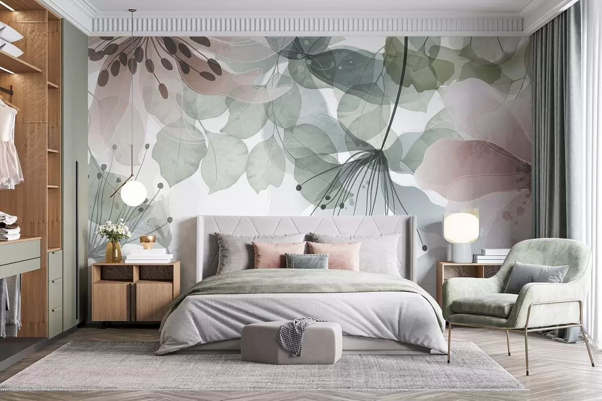 Fototapet Flori și frunze în culori pastelate, petale și frunze translucide, efect de acuarelă moale, linii delicate, fundal alb Nr. w09107