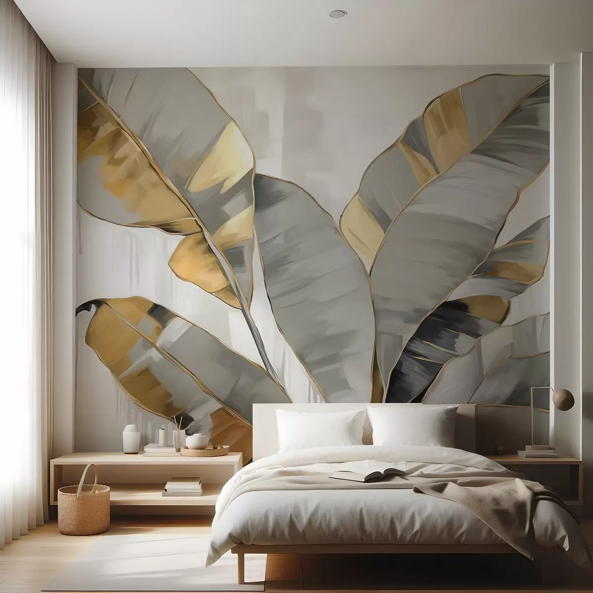 fototapet Banana tropicală frunze texturate cu tonuri gri și galben, stil modern, fundal neutru, pictură decorativă w09118