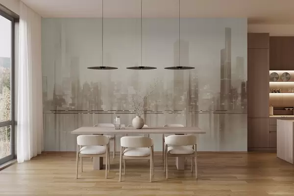 Fototapet Peisaj urban abstract texturat cu clădiri înalte și benzi, în nuanțe de bej și alb, creând un efect de ceață Nr. w09119v1