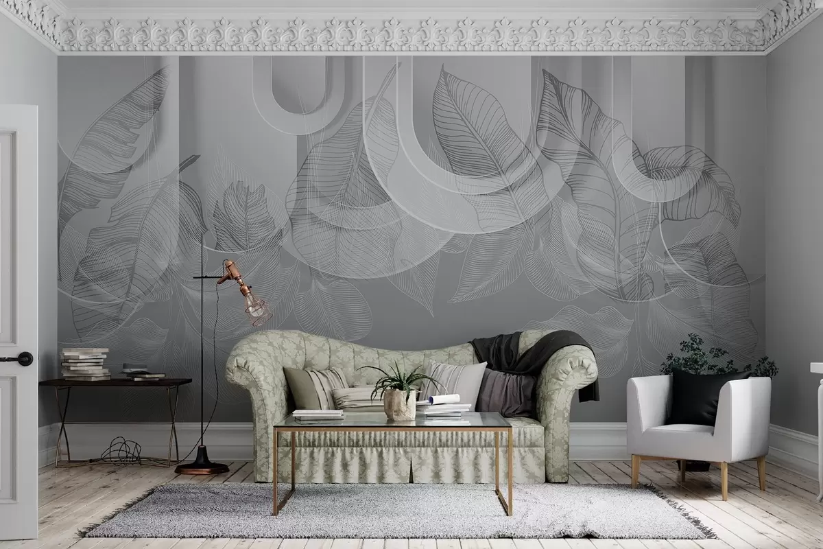 Fototapet Fundal abstract cu arcuri gri și frunze tropicale albe, design minimalist, elegant și modern, paletă de culori neutre Nr. w09138