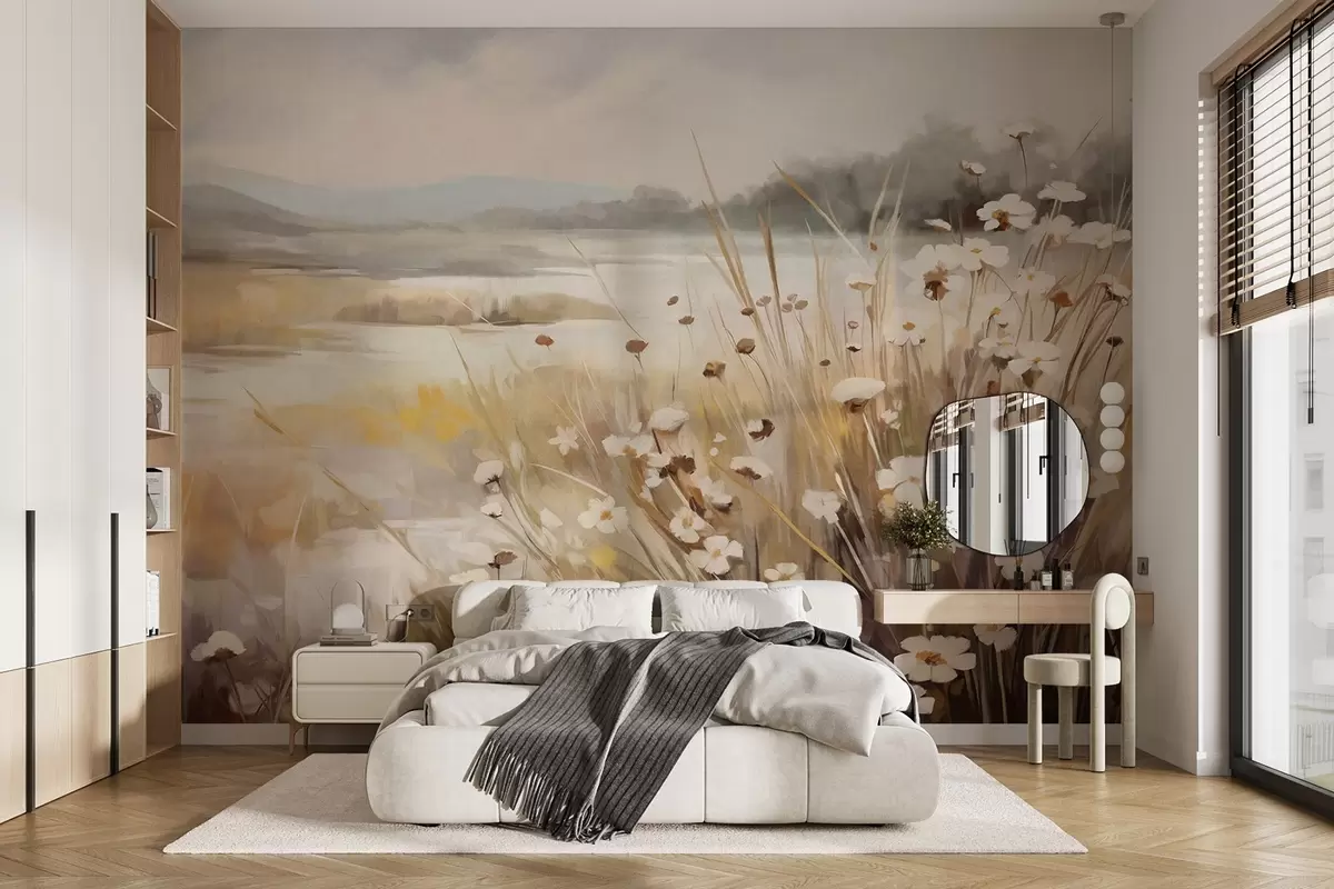 Fototapet Câmp de iarbă înaltă și margarete albe, copaci în fundal, sub un cer noros, peisaj texturat, tușe moi Nr. w09139