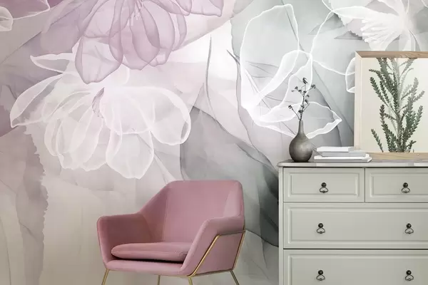 Fototapet Flori și frunze cu petale transparente în nuanțe de alb, roz și verde, moi și delicate Nr. w09158v1