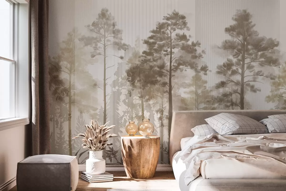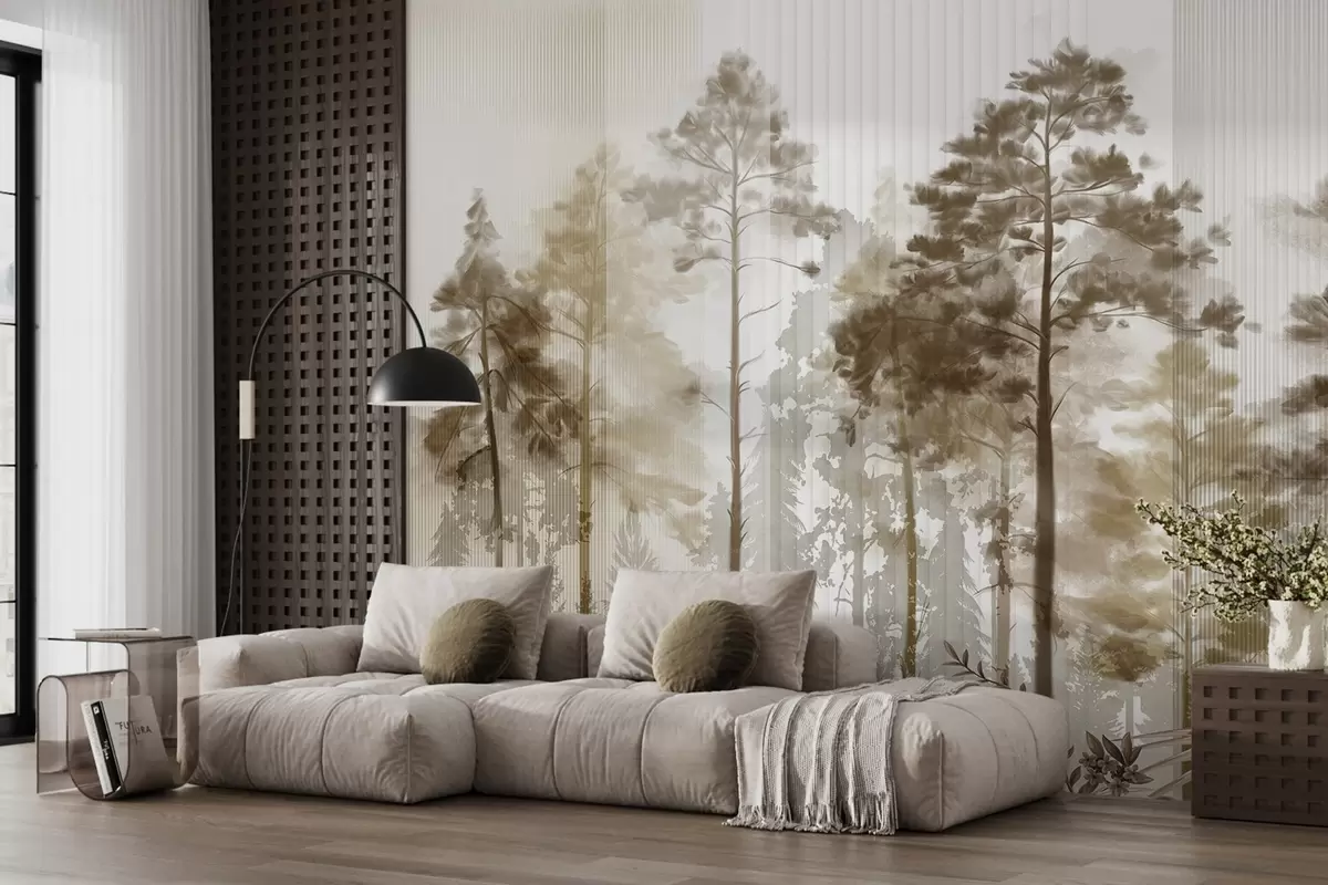 Fototapet O pădure densă cu pini înalți, frunze bej luxuriante, o atmosferă cețoasă cu texturi de linii verticale Nr. w09163v1