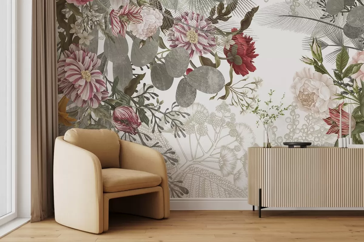 Fototapet Aranjament floral vintage cu trandafiri, eucalipt și mimosa în nuanțe de verde mat, roșu și roz Nr. w09164v1