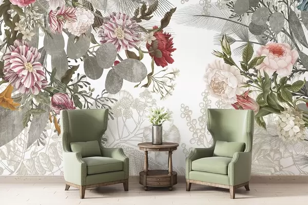 Fototapet Aranjament floral vintage cu trandafiri, eucalipt și mimosa în nuanțe de verde mat, roșu și roz Nr. w09164v1