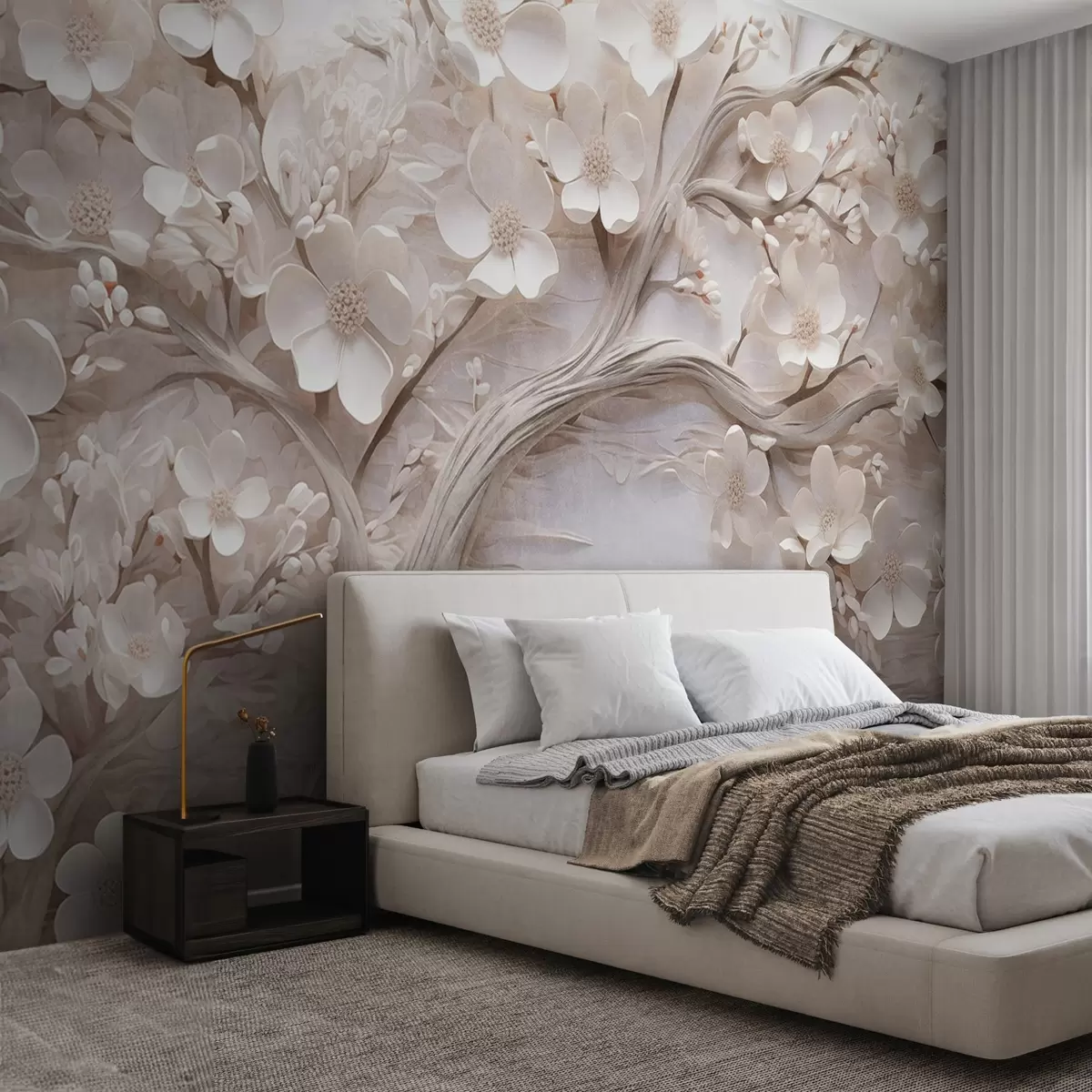 Fototapet Copac texturat cu flori albe și un trunchi maro, fundalul este alb cu linii orizontale iluminat moale Nr. w09166