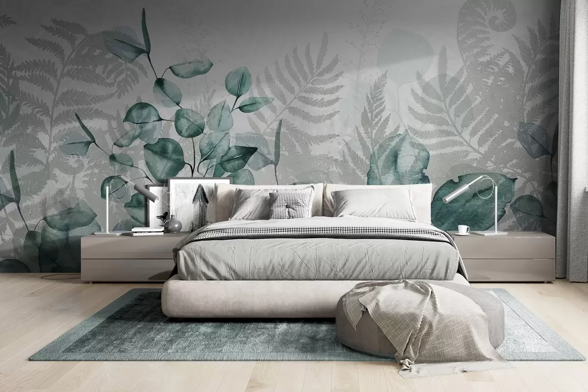 Fototapet Eucalipt și frunze de ferigă în nuanțe de verde și gri, efect de acuarelă , ilustrație botanică Nr. w09197