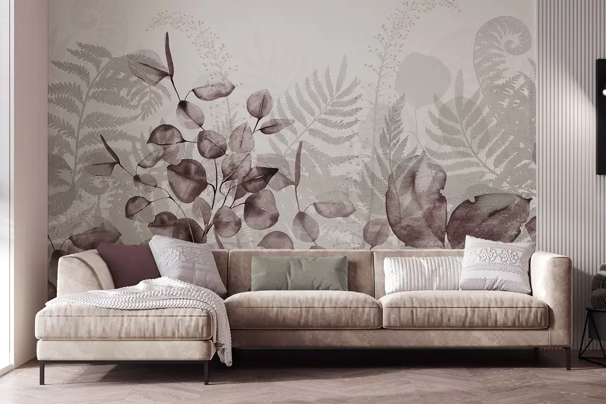 Fototapet Eucalipt și frunze de ferigă în nuanțe de bordo și gri, efect de acuarelă, ilustrație botanică Nr. w09197v1