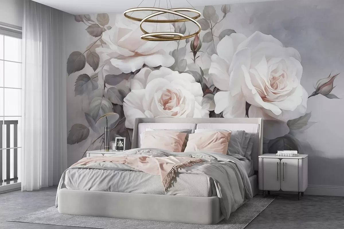 Fototapet Trandafiri albi texturați cu frunze și tulpini, culori pastelate moi, stil vintage elegant, tușe delicate Nr. w09198
