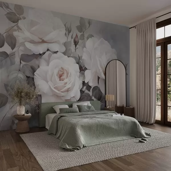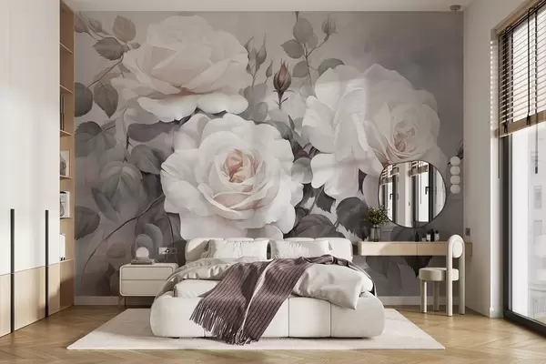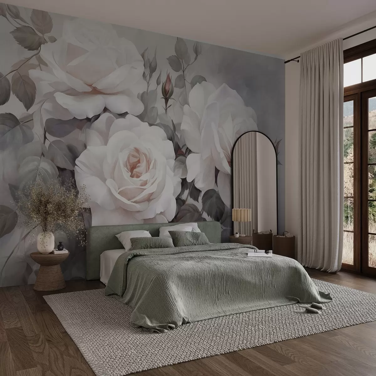 Fototapet Trandafiri albi texturați cu frunze și tulpini, culori pastelate moi, stil vintage elegant, tușe delicate Nr. w09198