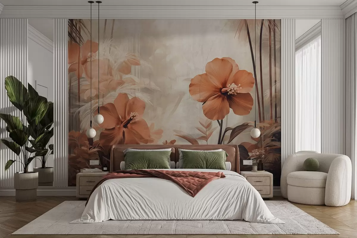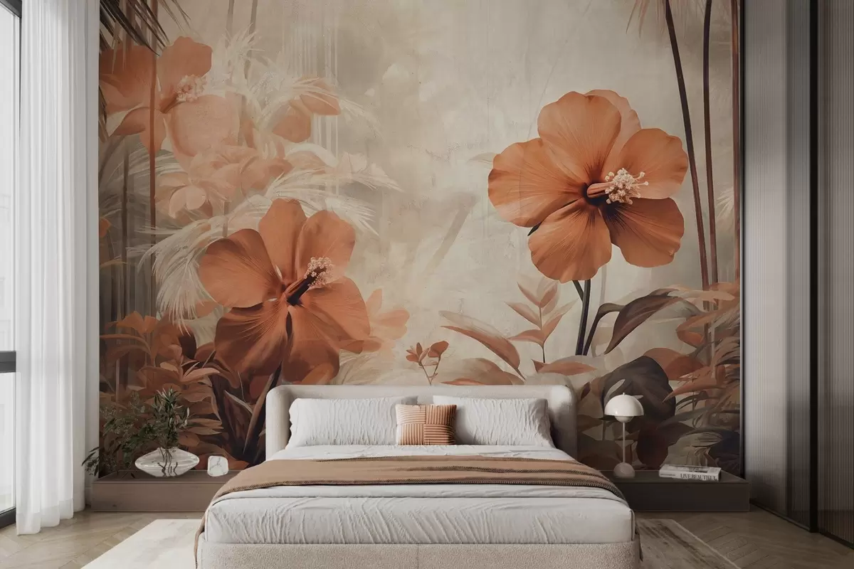 Fototapet Pastel roșu flori de hibiscus cu frunze și tulpini, vegetație tropicală, culori moi, mute, stil vintage Nr. w09203