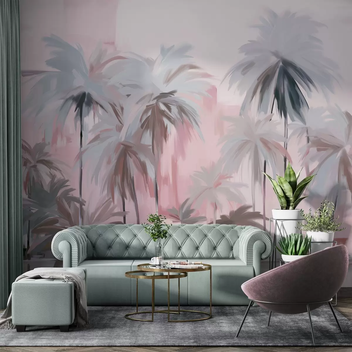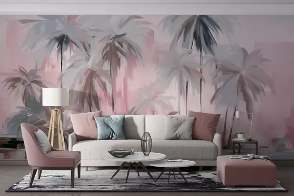 Fototapet Abstract minimalist pastel palmieri tropicali, pe un fundal de nuanțe mute roz și gri Nr. w09212v1
