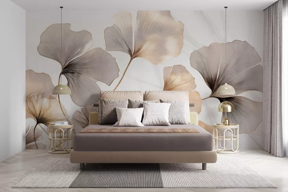 Fototapet Ginkgo biloba frunze în tonuri de bej, galben și maro, efect de acuarelă cu textură delicată, fundal deschis Nr. w09215