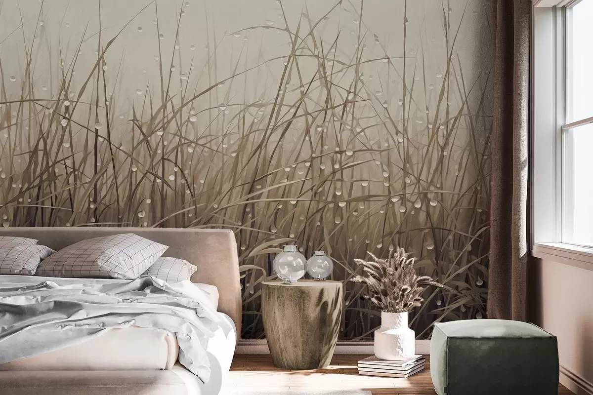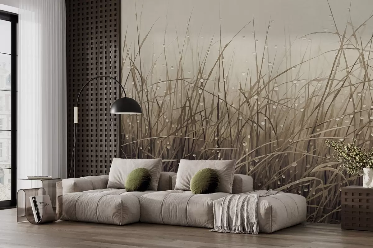 Fototapet Iarbă cu picături de apă, nuanțe de maro atenuate, lumină moale, fundal cețos, stil abstract minimalist texturat Nr. w09217v1