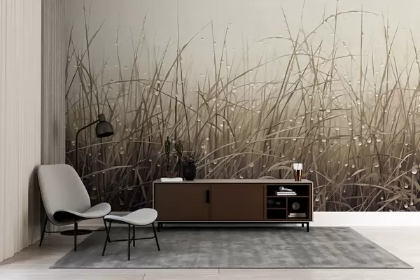 fototapet Iarbă cu picături de apă, nuanțe de maro atenuate, lumină moale, fundal cețos, stil abstract minimalist texturat w09217v1