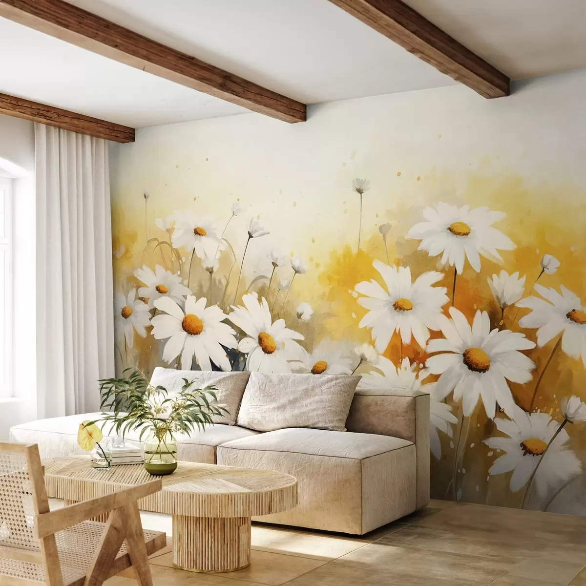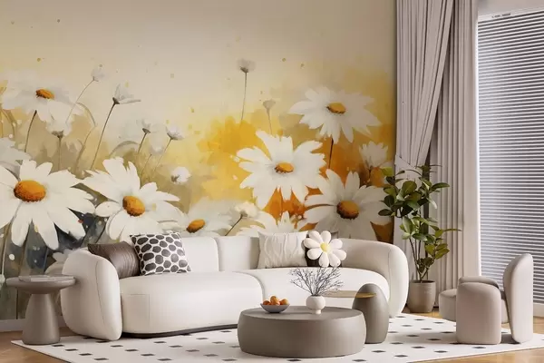 Fototapet Un câmp de margarete albe cu centre galbene, pe un fundal galben și bej moale, stil acuarelă Nr. w09218