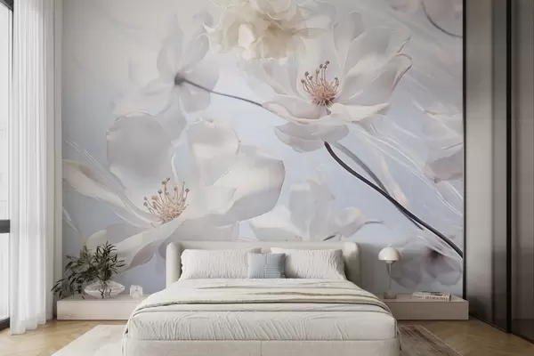 Fototapet Flori albe transparente texturate cu petale delicate, fundal albastru deschis moale, elegant, romantic, visător Nr. w09233