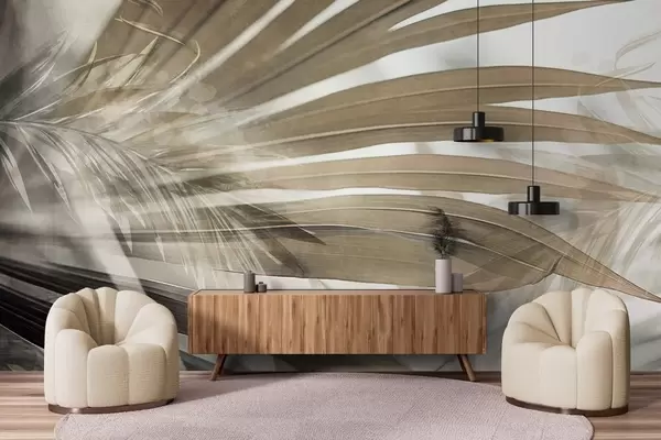 Fototapet Frunze de palmier cu o nuanță maro deschis, suprapuse și creând un efect stratificat, pe un fundal moale, neutru Nr. w09256