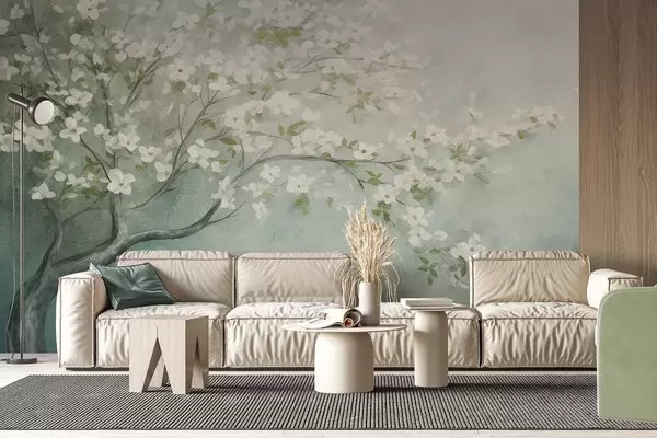 Fototapet Un copac înflorit cu flori albe în plină înflorire, pe un fundal cu textură granuloasă zgomotoasă de albastru și verde stins Nr. w09261