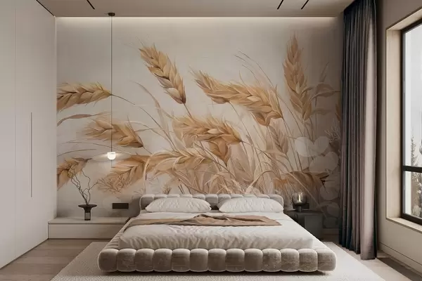 Fototapet Câmp cu textură de grâu, cu spice de grâu bej care se leagănă în vânt, culori moi și atenuate, creând un sentiment de căldură Nr. w09264