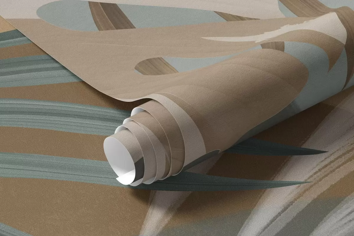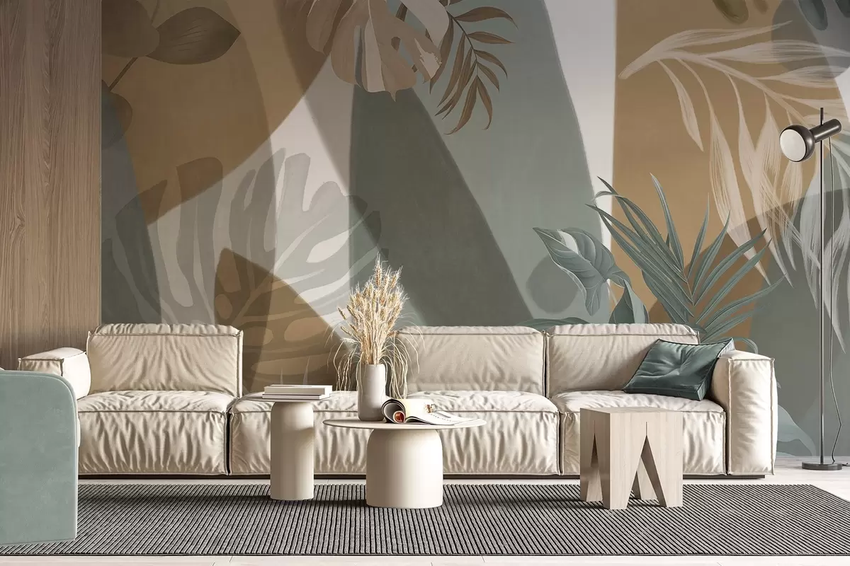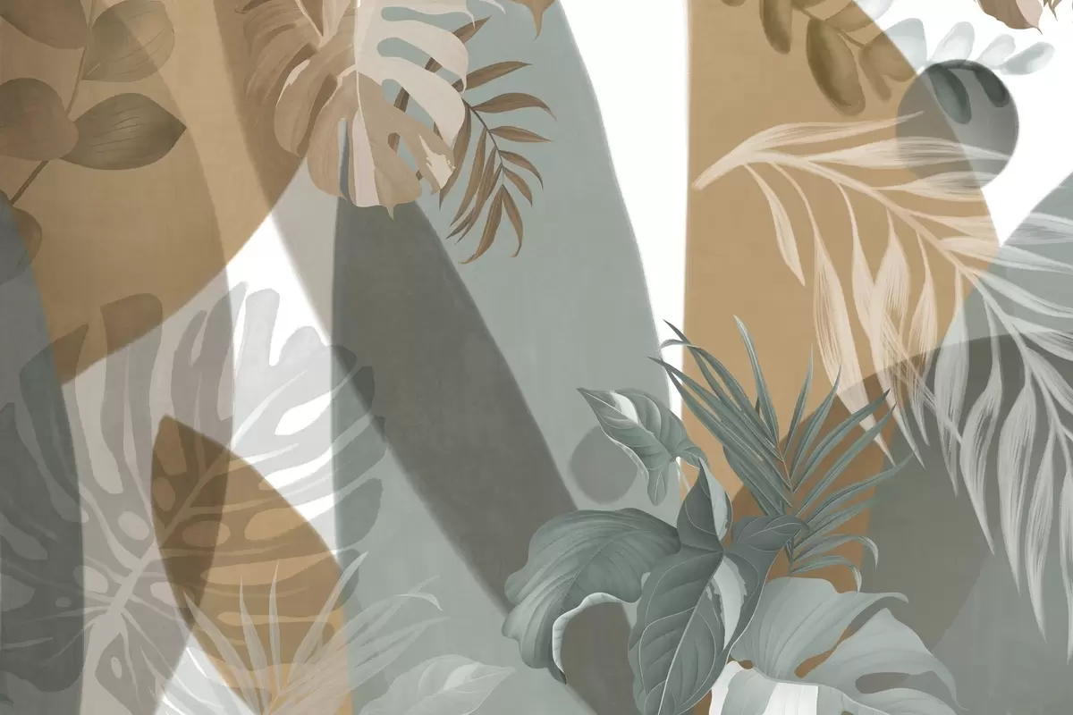 Fototapet Frunze Monstera și frunze de palmier într-un model cu culori maro, alb și verde, vibe tropical, forme abstracte, decorative Nr. w09288