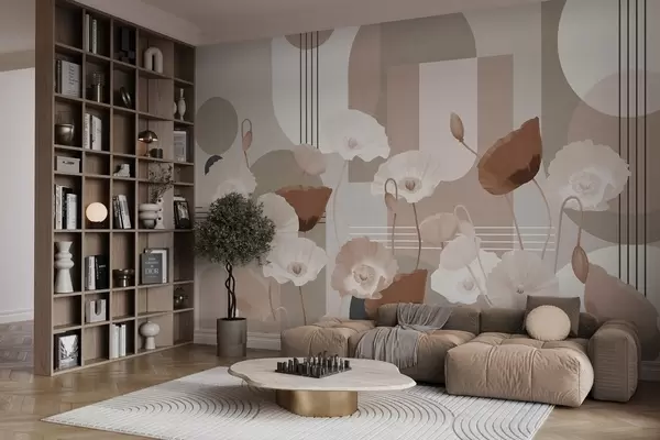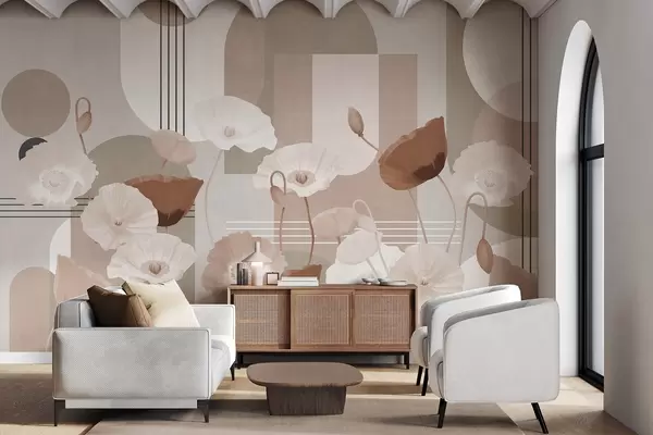 Fototapet Mac în culorile alb și bej cu forme geometrice în fundal, cercuri și arcuri, stil minimalist, culori moi Nr. w09289