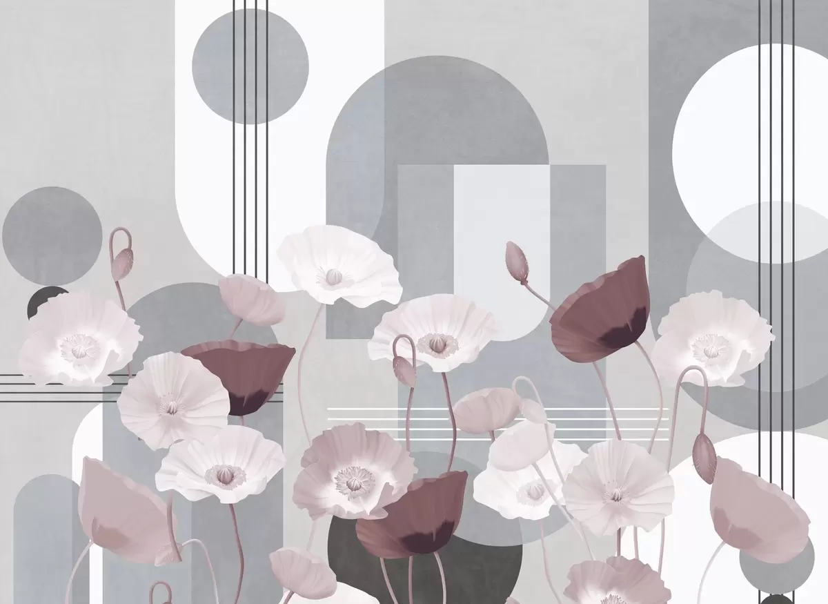 Fototapet Mac în culori albe și gri cu forme geometrice în fundal, cercuri și arcuri, stil minimalist, culori moi Nr. w09289v1