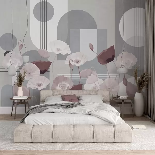 fototapet Mac în culori albe și gri cu forme geometrice în fundal, cercuri și arcuri, stil minimalist, culori moi w09289v1