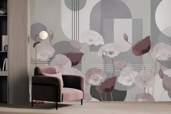 Fototapet Mac în culori albe și gri cu forme geometrice în fundal, cercuri și arcuri, stil minimalist, culori moi Nr. w09289v1