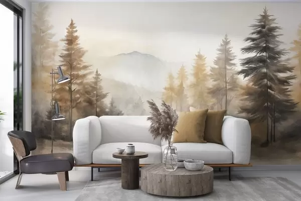 Fototapet Pădure de toamnă texturată cu pini înalți și munți în fundal, culorile sunt mute și stilul de pictură pământesc Nr. w09290
