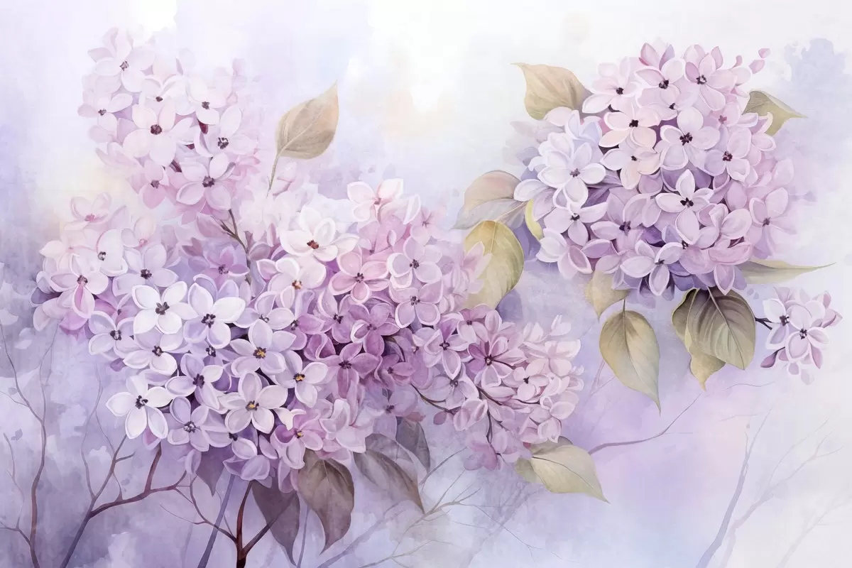 Fototapet Flori lila texturate cu petale violet deschis, frunze verde deschis, stil acuarelă, culori moi, pastelate, tușe delicate Nr. w09291