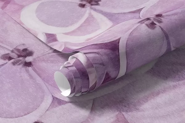 fototapet Flori lila texturate cu petale violet deschis, frunze verde deschis, stil acuarelă, culori moi, pastelate, tușe delicate w09291