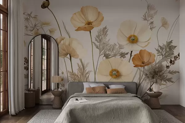Fototapet Portocaliu și alb vintage texturat maci cu tulpini subțiri și frunze, fundal bej deschis, stil acuarelă Nr. w09293