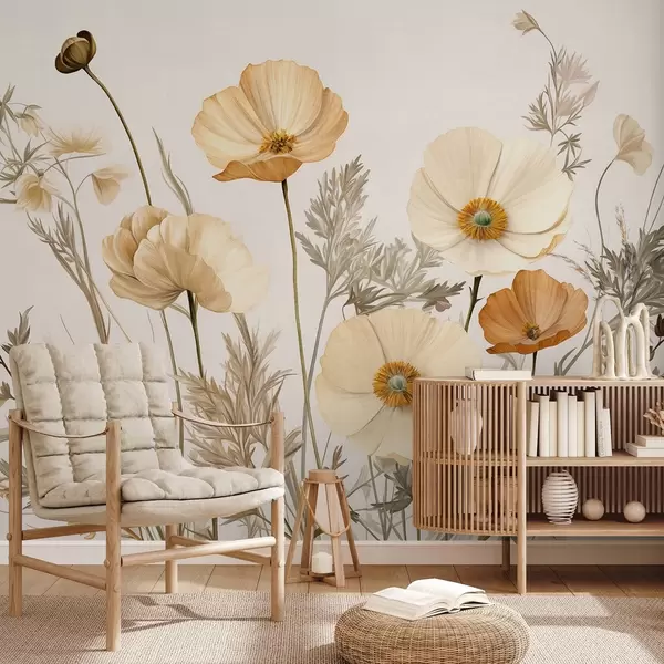 Fototapet Portocaliu și alb vintage texturat maci cu tulpini subțiri și frunze, fundal bej deschis, stil acuarelă Nr. w09293
