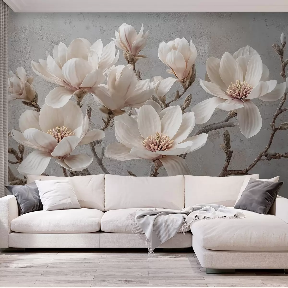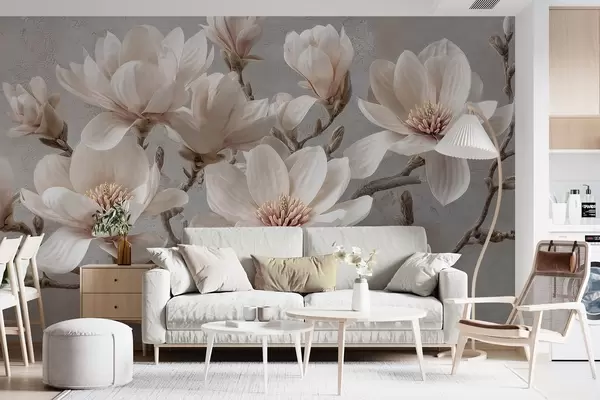 Fototapet Ramuri de magnolie cu flori mari de lumină în tonuri atenuate Nr. w09305