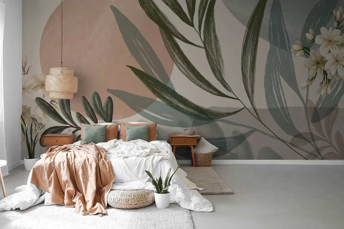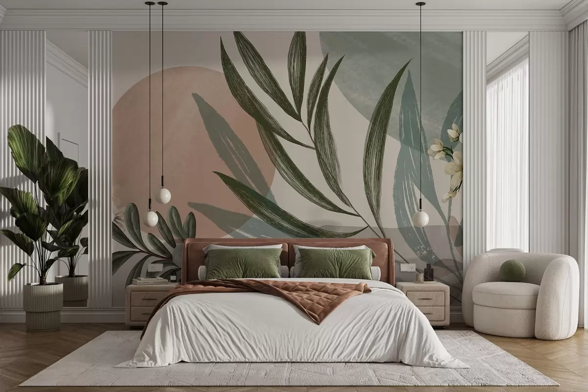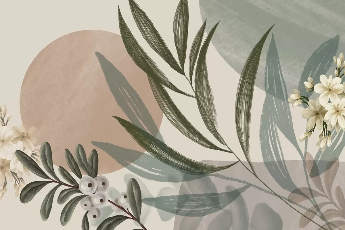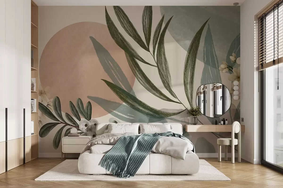 Fototapet Artă botanică abstractă cu frunze de palmier verzi și fructe de pădure albe, pe un fundal de forme în tonuri de pământ atenuate Nr. w09312