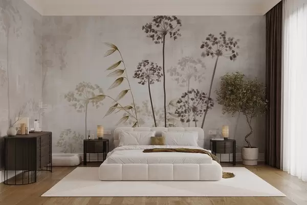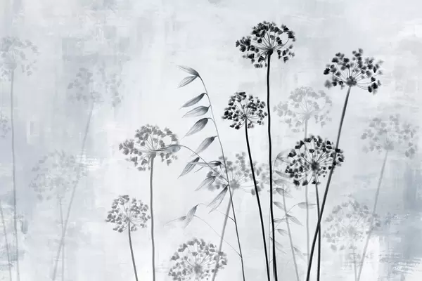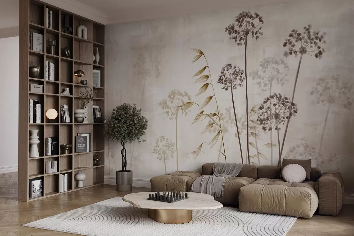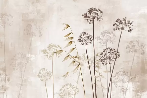 Fototapet Desen de flori uscate cu tulpini lungi, paletă monocromă, pe un fundal texturat, bej deschis, ilustrație botanică Nr. w09314v1