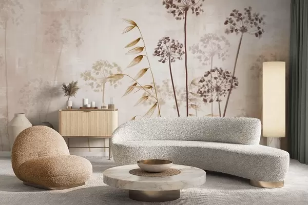 Fototapet Desen de flori uscate cu tulpini lungi, paletă monocromă, pe un fundal texturat, bej deschis, ilustrație botanică Nr. w09314v1