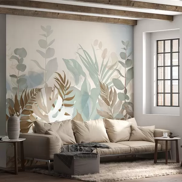 Fototapet Pastel plante ferigi, monstera și eucalipt, lumina texturat fundal, iluminat moale, pașnică , ilustrare botanică Nr. w09316v1