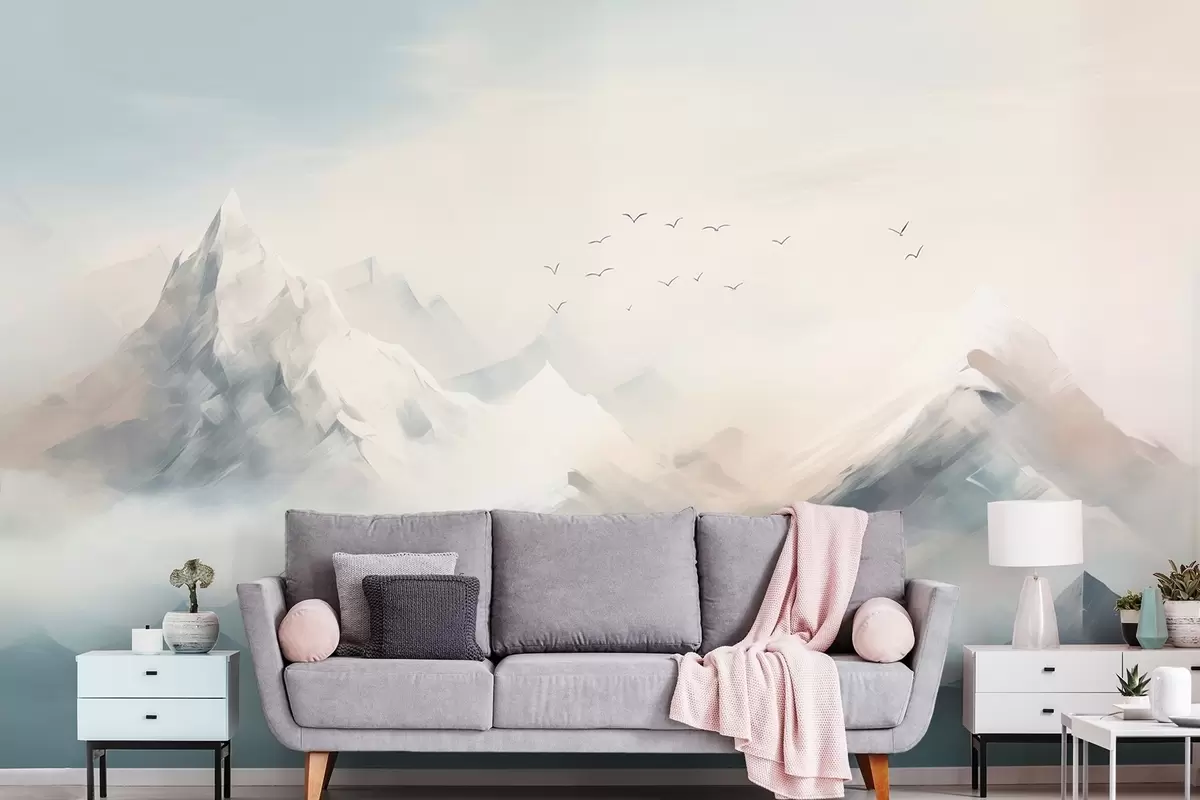Fototapet Vârfuri muntoase acoperite de zăpadă în ceața dimineții, cu păsări în zbor Nr. w09326