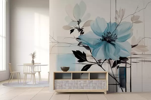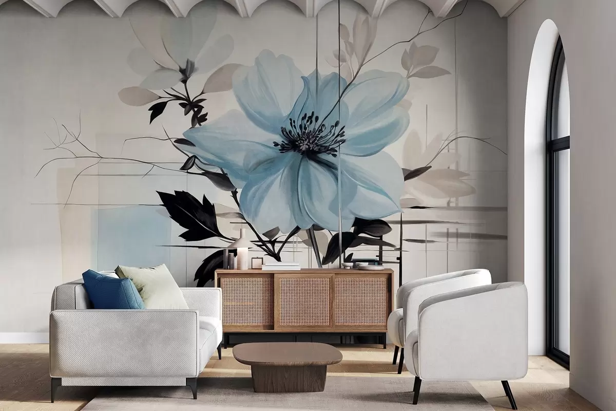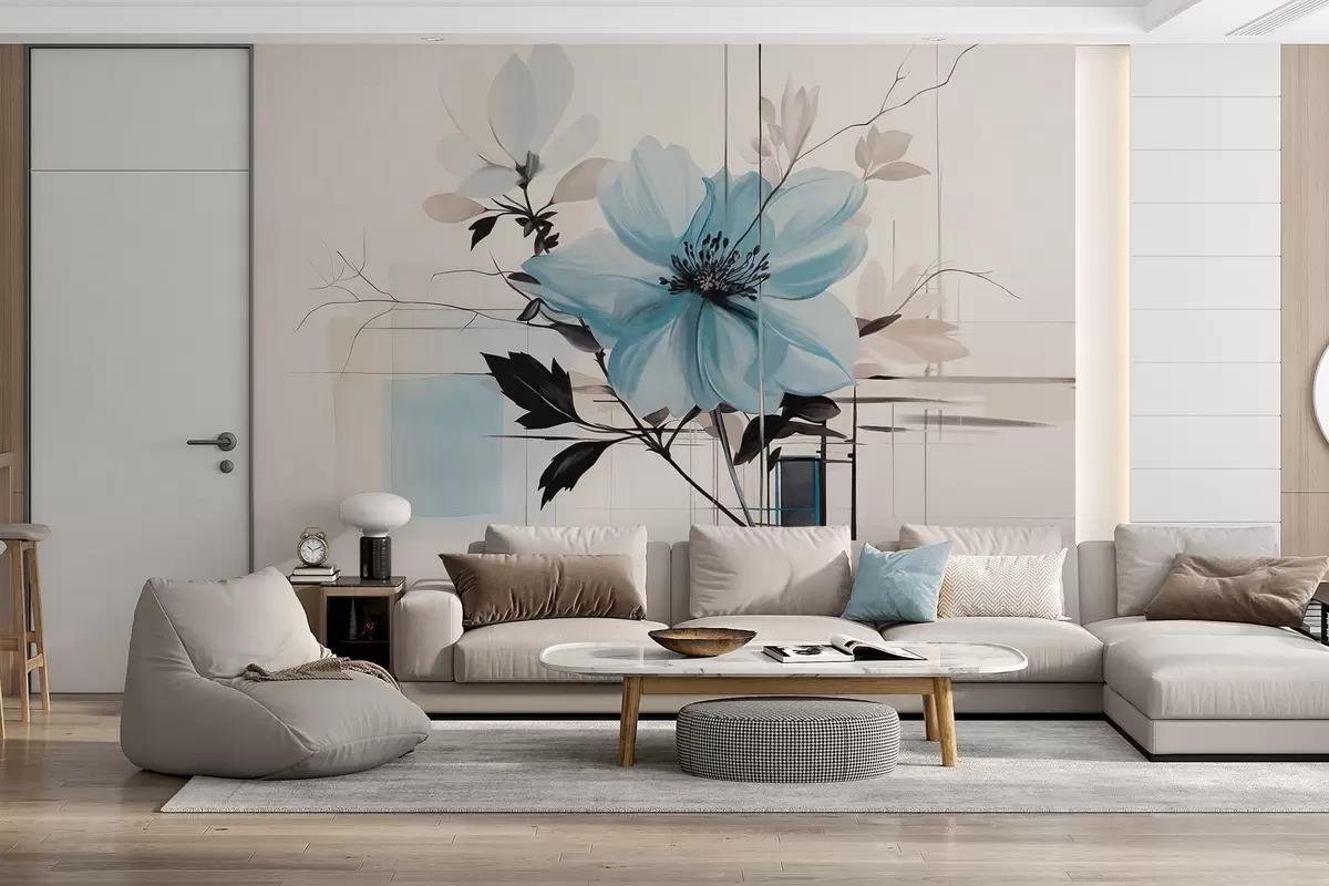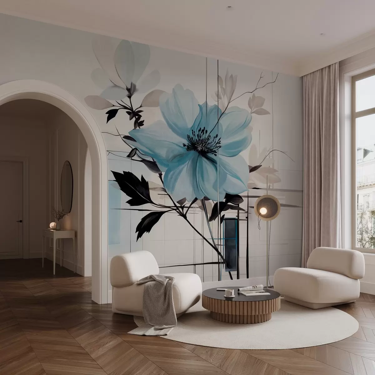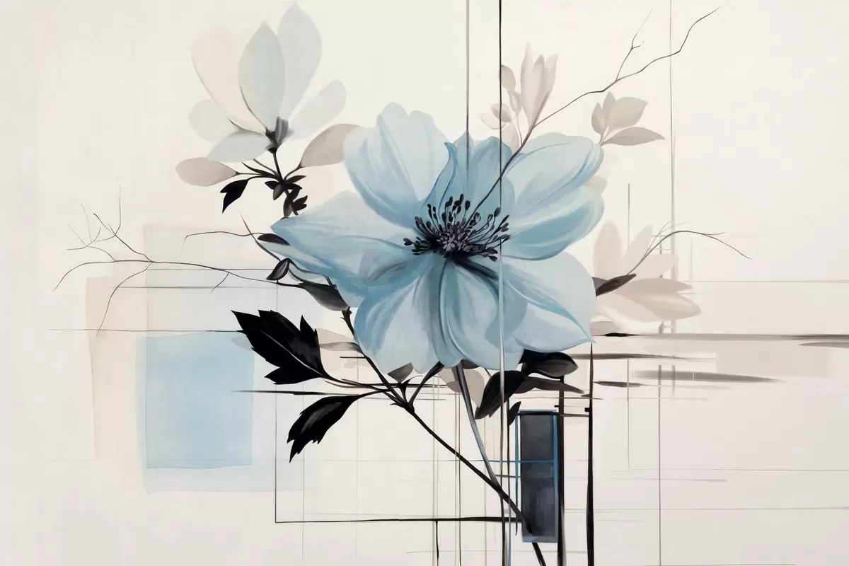 Fototapet Floare albastră abstractă texturată cu frunze și ramuri întunecate, forme geometrice minimaliste și linii în culori stinse Nr. w09332