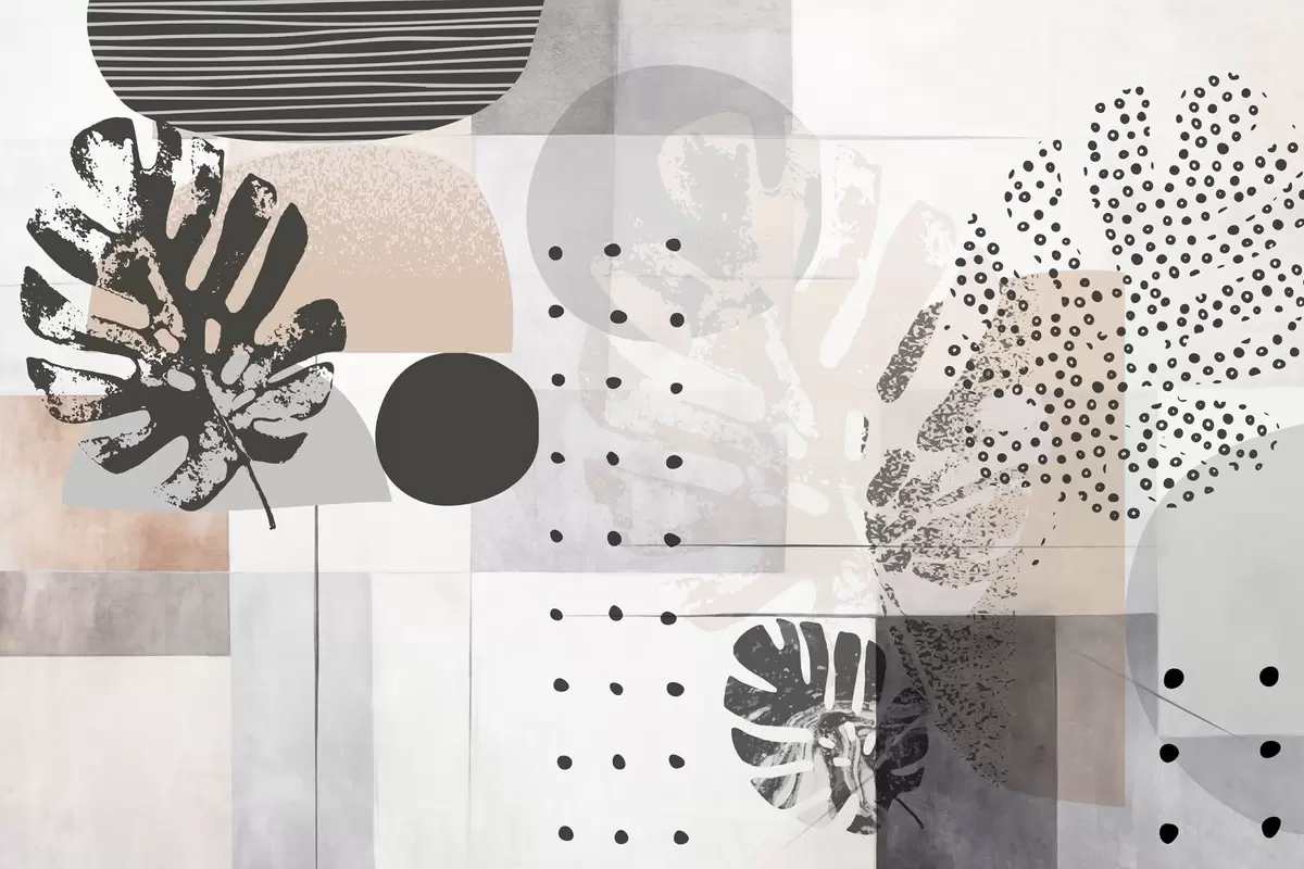 Fototapet Print abstract cu forme geometrice și frunze tropicale monstera, cercuri, puncte și linii, design modern și minimalist Nr. w09333