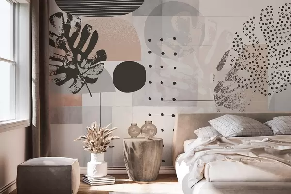 Fototapet Print abstract cu forme geometrice și frunze tropicale monstera, cercuri, puncte și linii, design modern și minimalist Nr. w09333