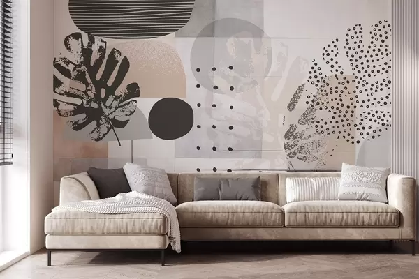 Fototapet Print abstract cu forme geometrice și frunze tropicale monstera, cercuri, puncte și linii, design modern și minimalist Nr. w09333
